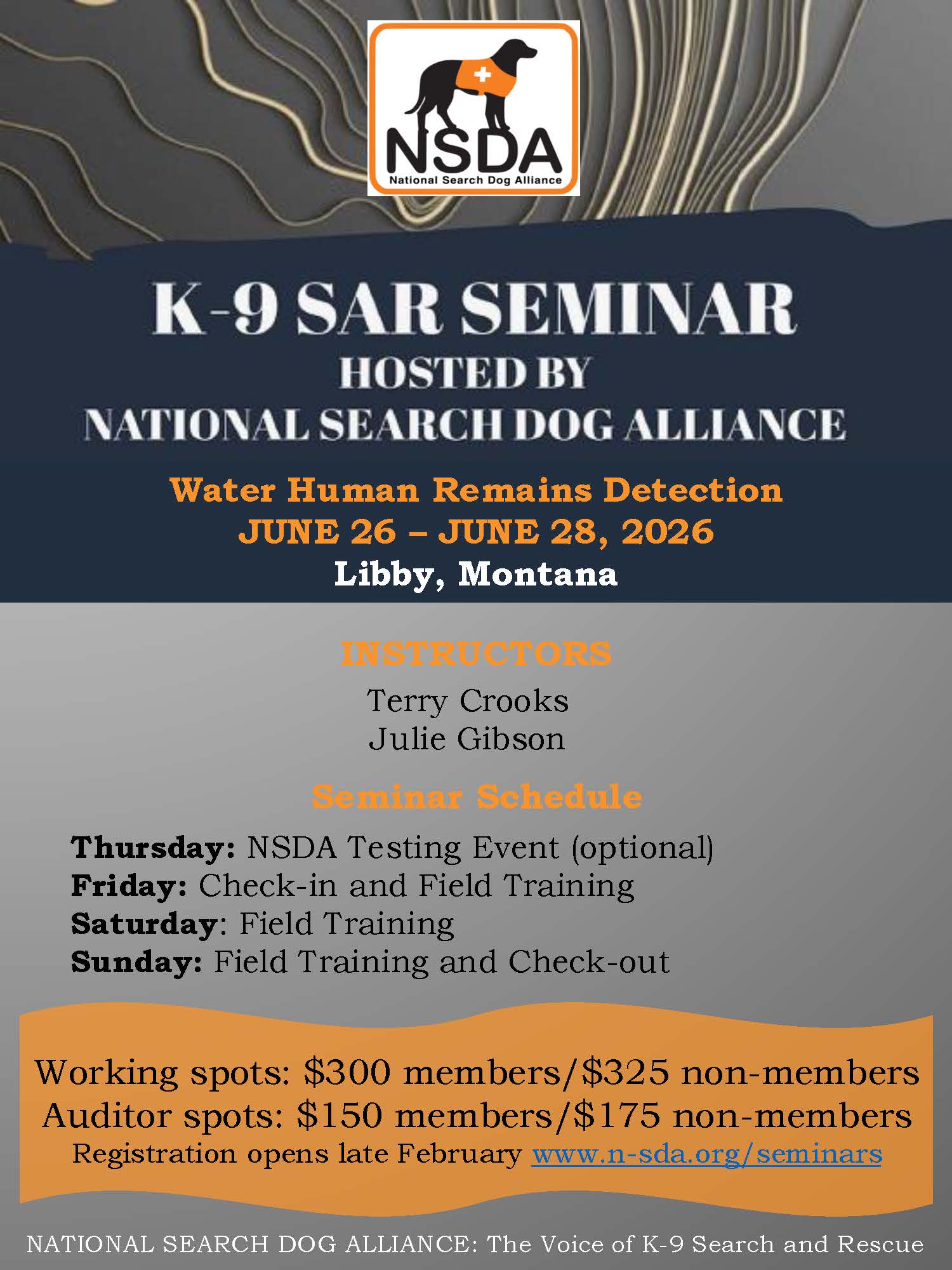 June 26 th — June 28th, 2026: Libby, Montana. Water Human Remains Detection field seminar offering instruction in water human remains detection operations.